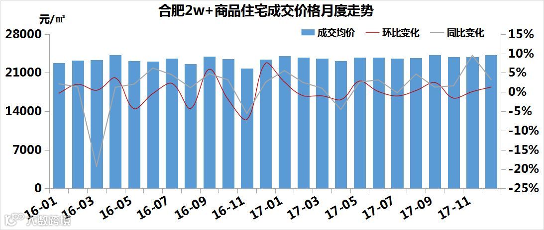 合肥均价2w+的住宅市场,成交均价整体是处于稳定状态,均价稳定在24000元/㎡左右;2017年12月,房价为24206.77元/㎡,环比涨1.3%。