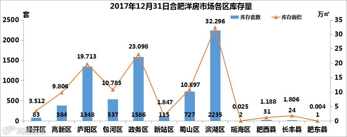 截止到2017年12月31日,合肥均价2w+的商品住宅库存量为7073套/114.97万㎡,其中滨湖区库存量最高,共计2235套/32.296万㎡。