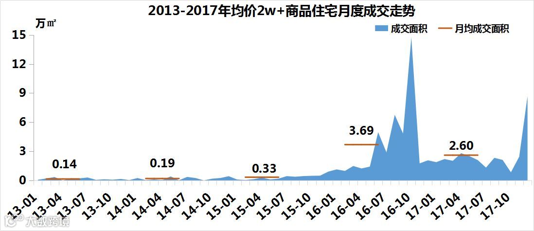 由于限购限价政策和分级备案等原因,合肥2万元/㎡以上的商品住宅成交量大幅减少,2017年月均销量为2.6万㎡。