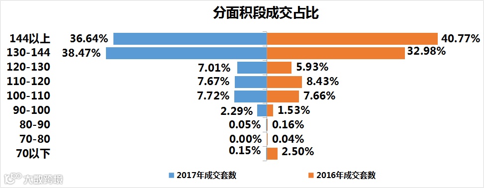 2017年,从分面积段来看,合肥均价2w+的商品住宅市场以130㎡以上的户型为成交的主力,成交占比75.11%,比2016年增加了1.35%。