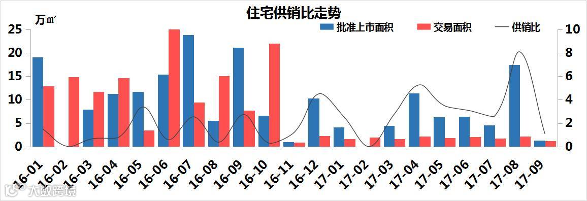 进入到2017年,很明显的供、销量均减少了,但是每一季度的住宅市场供应都大于需求;而8月份供应量大幅上涨,主要是由于时光印象新增448套/5.09万㎡商品住宅,抬高了区域供应量。