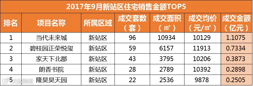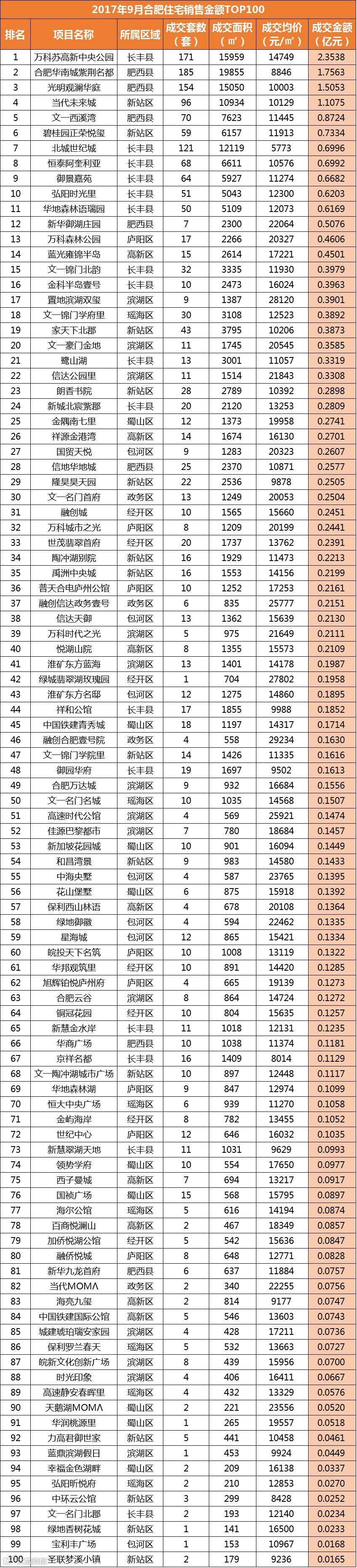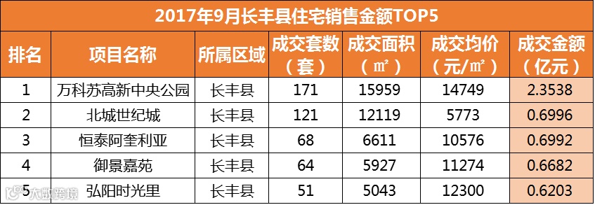 从销售金额来看,长丰县的万科苏高新中央公园居成交金额排行榜榜首列,共计2.3538亿元;TOP10排名榜上,长丰县进军5盘,肥西县3盘,新站区2盘。
