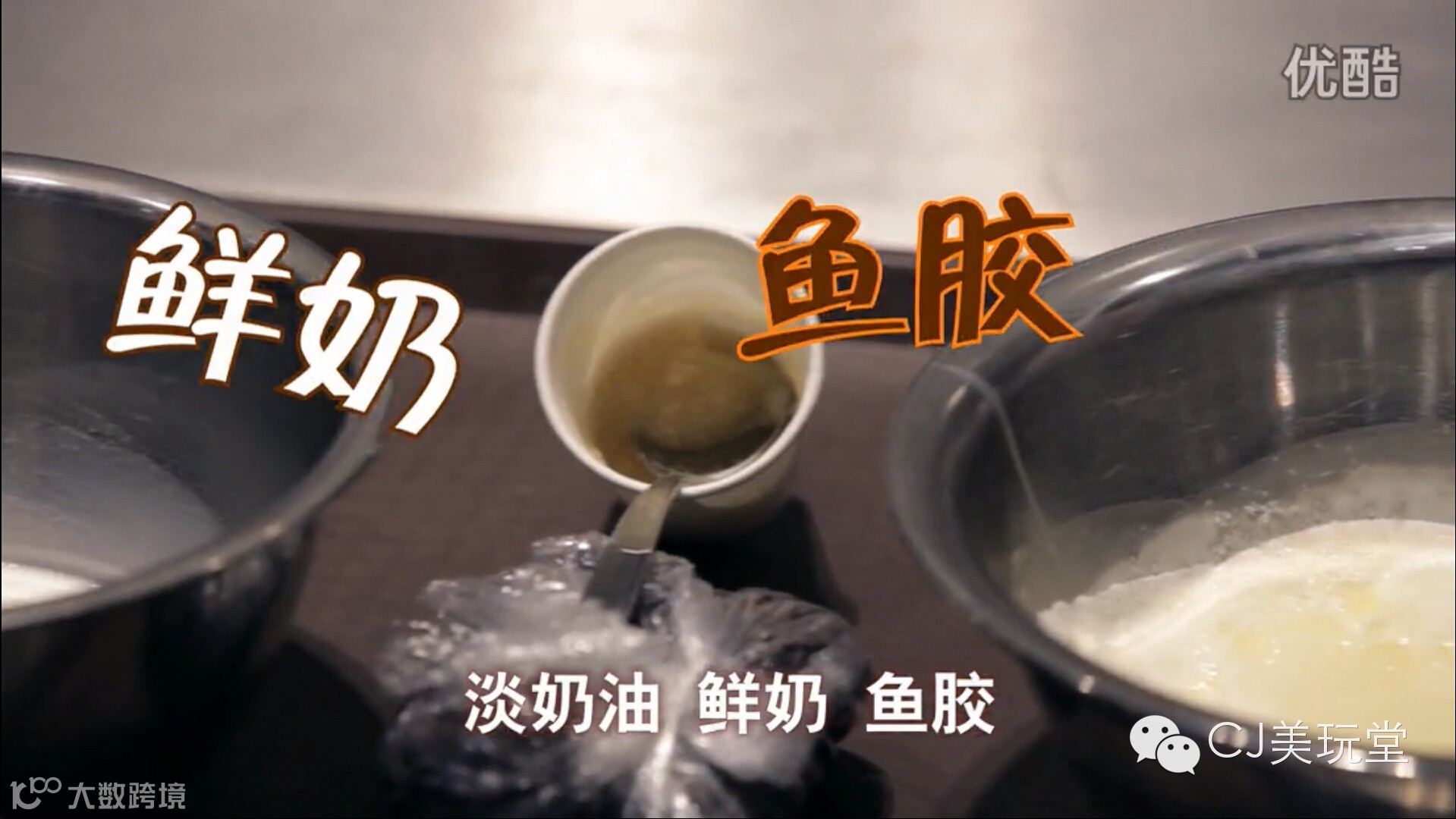 制作蛋糕需要准备四种物品,巧克力豆、淡奶油、鲜奶、鱼胶,打发器。