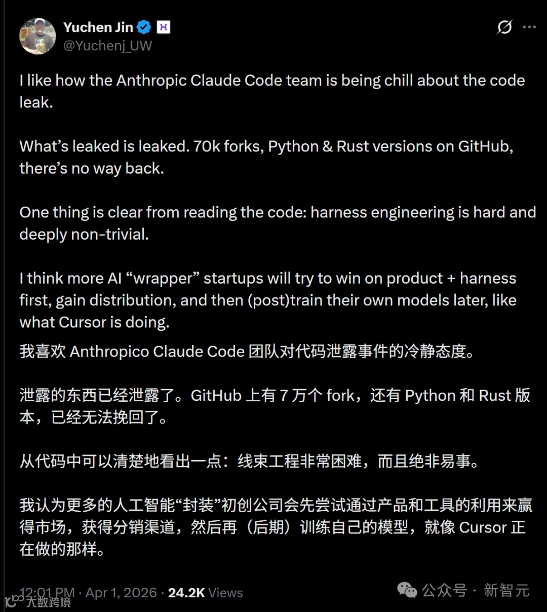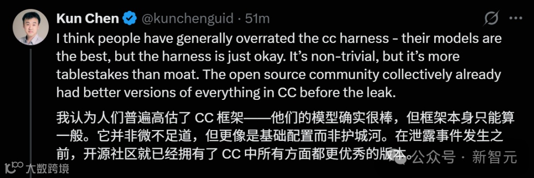 不少圈内人在复盘泄露的代码后,得出了冷静结论:Claude Code的框架本身并不神秘。 甚至有人直言不讳地指出,CC的框架只能算中规中矩,更像是基础配置。