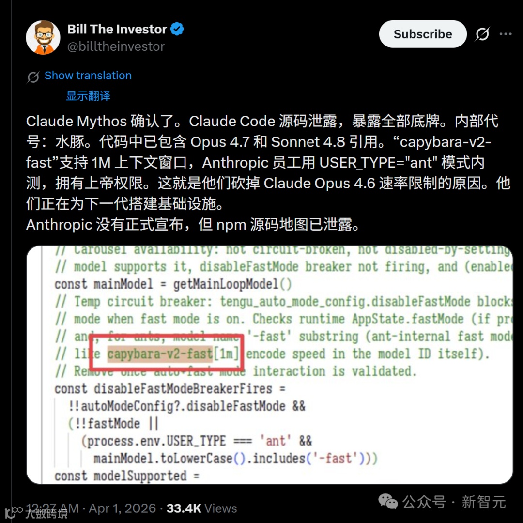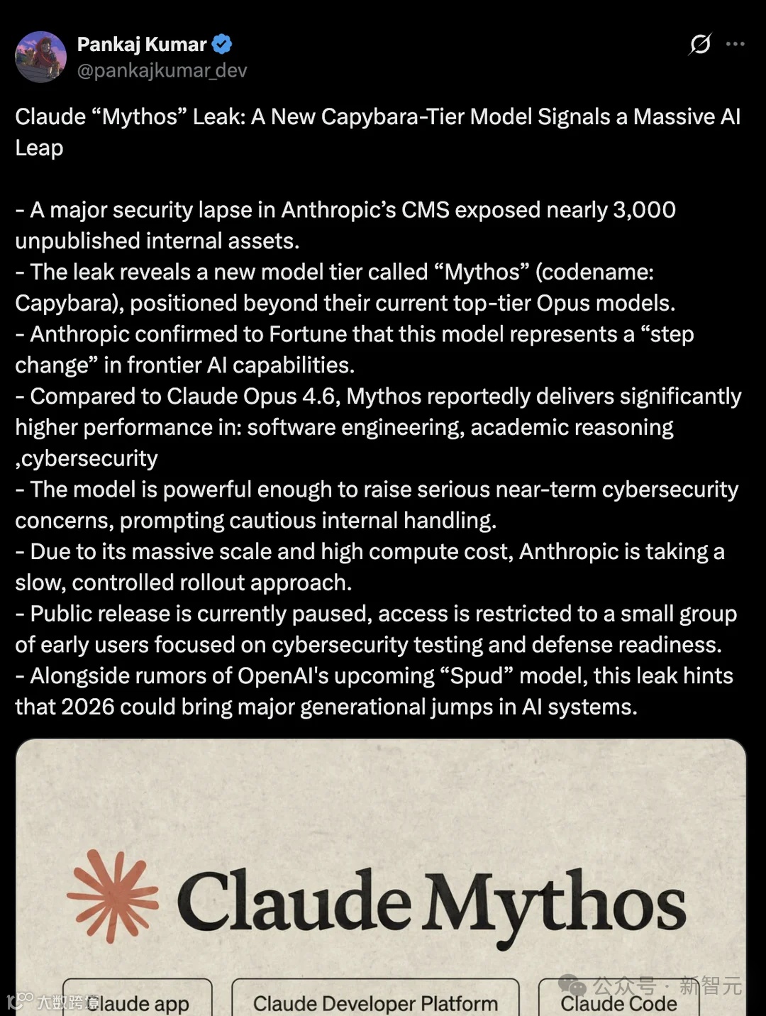 【导读】Anthropic神秘王炸Mythos的基准测试泄露了,多项跑分直接刷新纪录!另外,泄露源码中还曝光出卡皮巴拉的细节:代号capabara-v2-fast,支持1M上下文。
