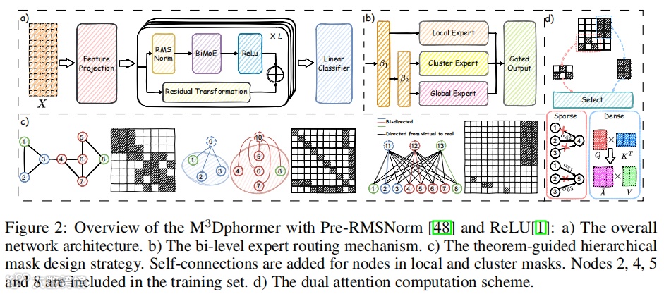针对现有图Transformer架构往往为特定交互深度定制导致灵活性受限,以及面对海量节点极易显存溢出的双重困境,本文提出了M3Dphormer模型。该方案基于一个新颖的统一层级掩码理论构建,并在底层引入双层混合专家(MoE)路由机制来自适应融合局部、簇级与全局交互特征。同时搭配动态双重注意力计算方案,在稀疏与密集注意力之间智能切换,全面兼顾了表达能力与极致的扩展性。