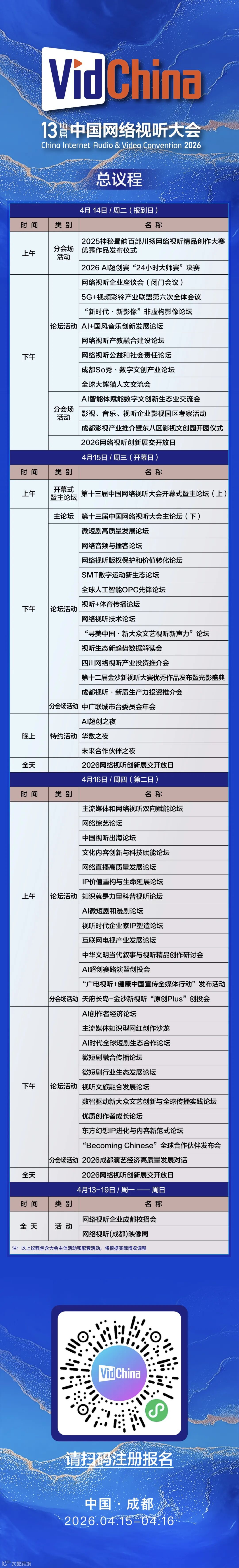 据悉,大会主体活动时间为4月15日-16日,配套活动时间为4月13日-19日,由国家广播电视总局、四川省人民政府主办,中国网络视听协会、成都市人民政府、中国广电承办。