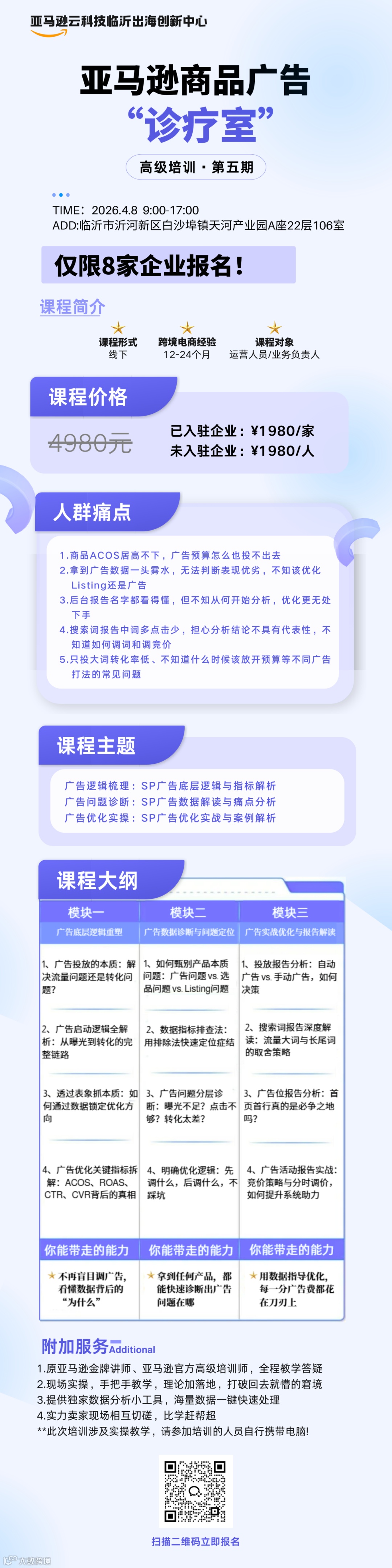 亚马逊云科技临沂出海创新中心 深知临沂本地卖家的痛点与需求,重磅推出「亚马逊商品广告“诊疗室”高级培训·第五期」,用专业诊断、系统教学、实战落地,帮你彻底打通广告投放全链路,让每一笔预算都产生真实价值。