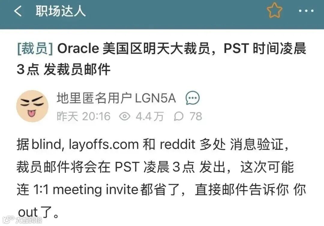 多位员工在领英(LinkedIn)上发帖表示,他们在清晨突然收到来自“甲骨文管理层”的邮件,邮件中写道:“在认真评估甲骨文当前的业务需求后,我们决定取消您的岗位。今天是您的最后一个工作日。”
