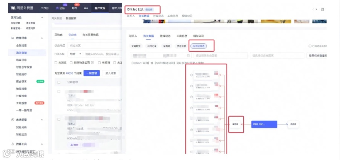 就能迅速找到所有国内外同行。点击任意一家供应商,就能看到他正在给哪些客户供货——这些客户,同样是你的潜在目标。