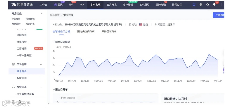 用产品关键词或HS编码查询,网易外贸通会一键汇总采购需求较多的市场,帮你识别潜在热销地区。