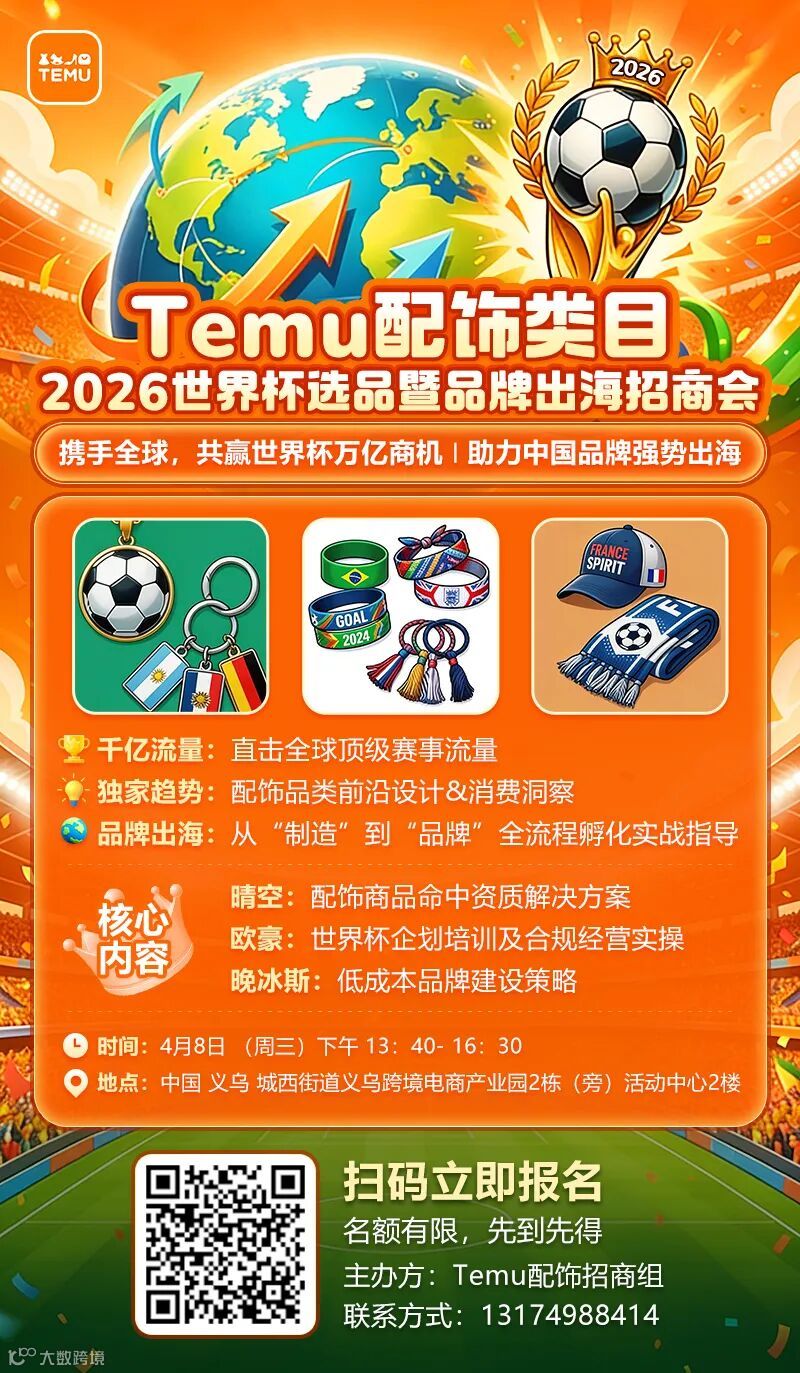 导读:2026 4月活动预告|4月TEMU配饰类目 世界杯选品招商会报名开启...