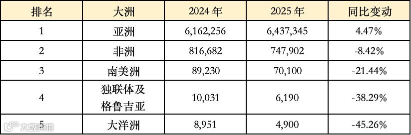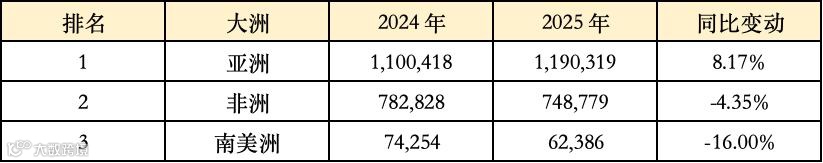 2025 年各大洲茶叶出口量排名(单位:吨)