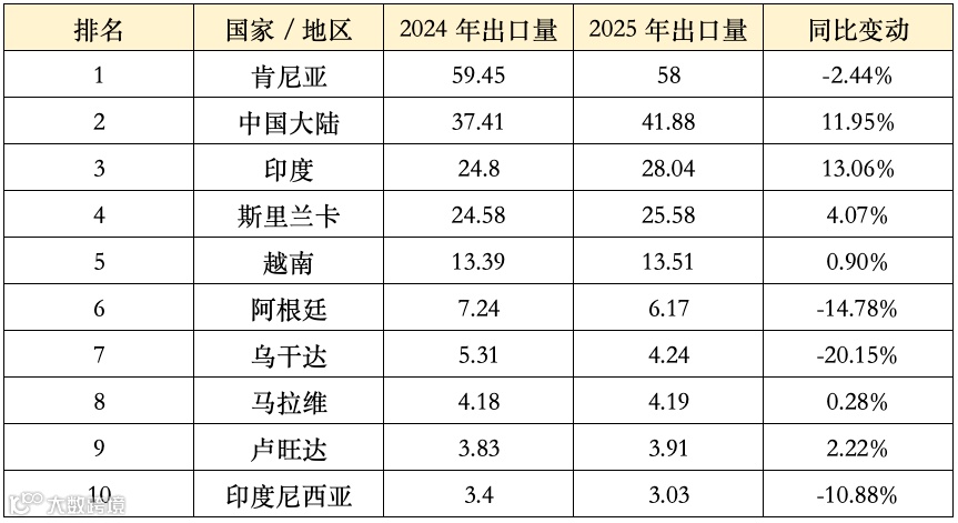 2025 年全球茶叶主要出口国出口量 TOP10(单位:万吨)