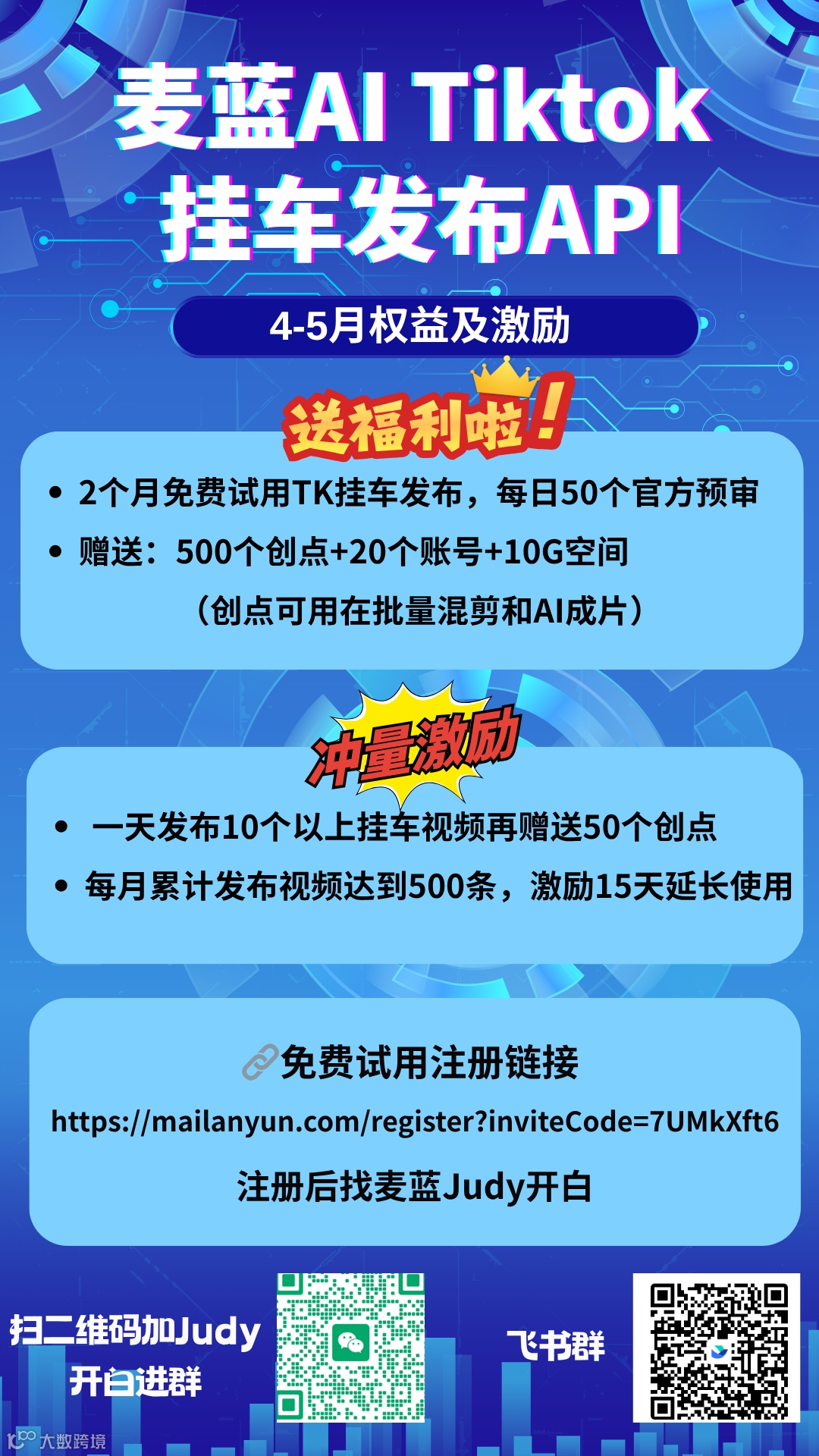 麦蓝AI Tiktok 挂车发布API(4~5月权益)