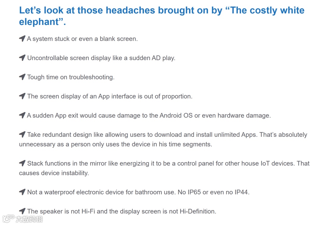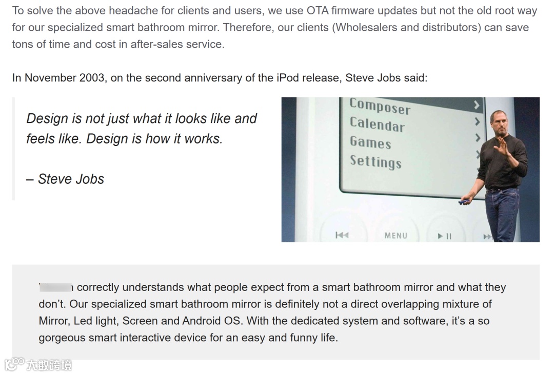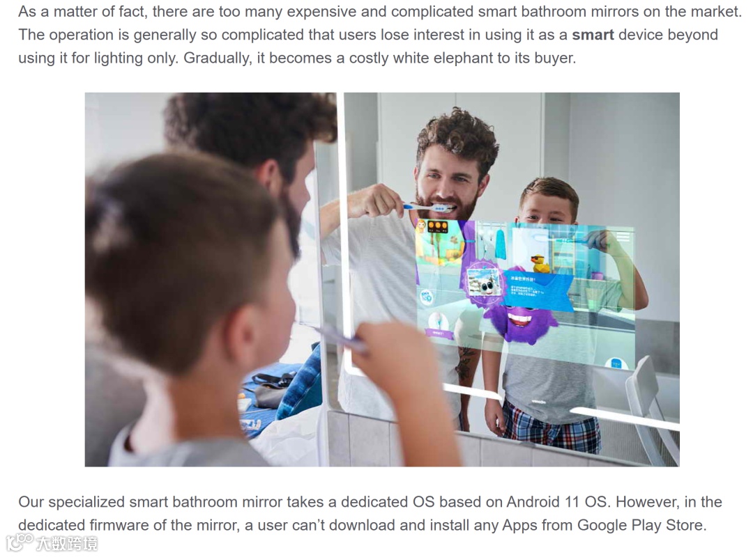 SEO汤师爷之所以用这样的表达,是因为甲方客户当初给我科普行业痛点和其公司 smart mirror 产品的优势:smart mirror 其实是个新行业,零售价不算便宜,行业里面很多家的产品因为软硬件没融合好,虽然外观看起来光彩夺目,客户出于尝新和追逐智能家居的潮流,花一两千美元买回去,结果发现触控和播放卡顿,体验极差......所以公司开发了专用的主板,做了专用的软件解决了该痛点,确实是领先的产品。