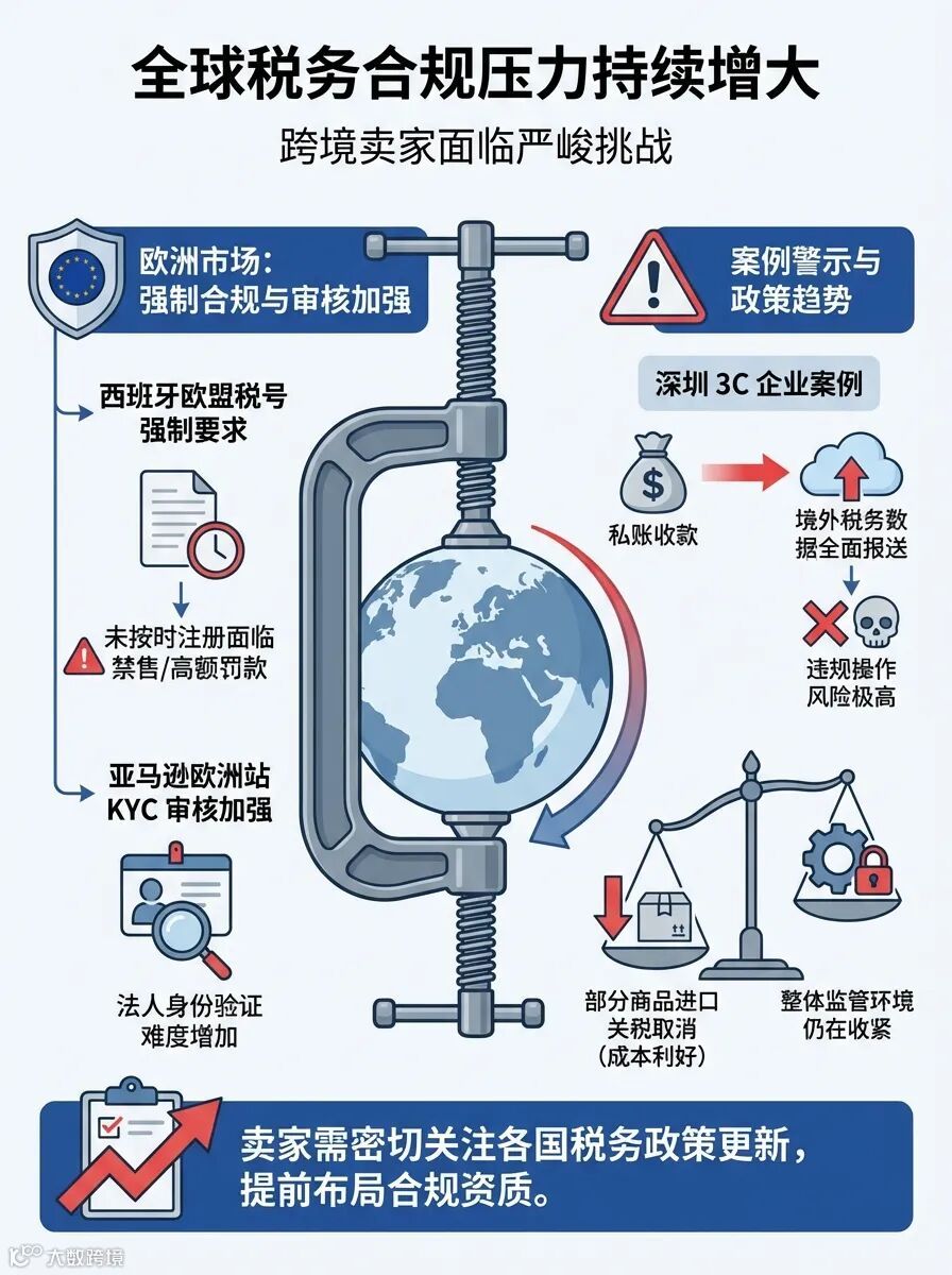 简评:合规成本正成为运营硬指标。🌍 西班牙税号新规影响广泛,卖家需优先处理;💡 关税取消利好有限,应更关注长期合规框架;⚠️ 深圳案例警示,税务透明化时代,规范财务是生存基础。