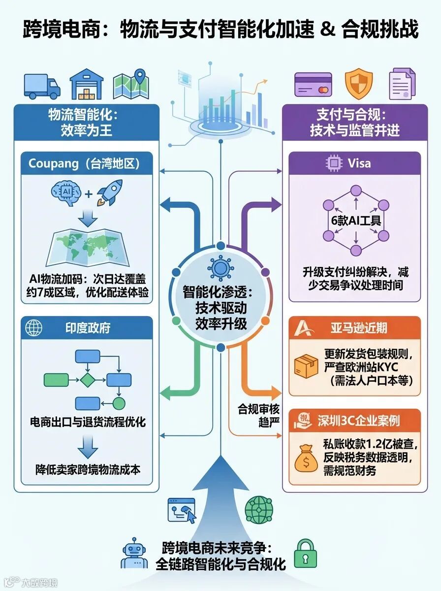 简评:物流与支付环节的AI化是降本增效的核心。🏆 Coupang的案例表明,次日达等体验升级可成为平台差异化优势;💡 卖家应关注Visa等工具,以降低纠纷率;⚠️ 同时,亚马逊KYC严查提醒我们,技术应用需与合规同步。