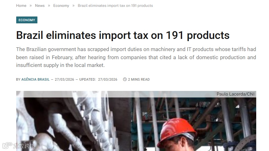 据ANBA 3月27日消息,巴西贸易委员会Gecex/Camex于周四(26日)决定,将2月份上调进口关税的约200种资本货物(用于生产的机械和设备)及信息技术产品的关税税率下调至零,为期四个月。该措施旨在降低工业成本,并确保国内无法生产同类产品的供应。