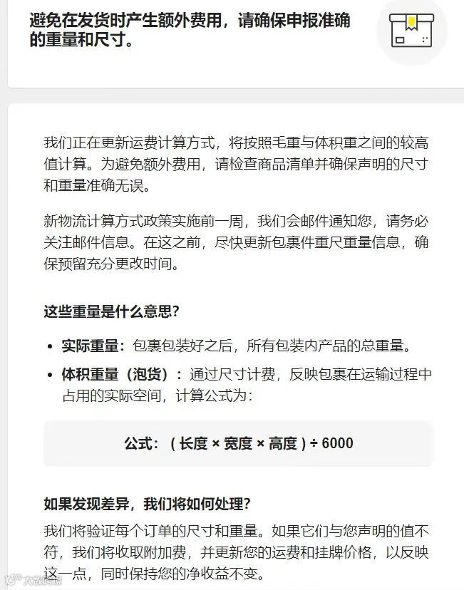 这里我特别想强调一句,后台通知本身其实已经在替卖家划线了:平台后面会按照“申报数据是否准确”来决定你是否产生额外费用。也就是说,平台不只是单纯涨价,而是在倒逼卖家把体积申报从“模糊填写”变成“真实经营”。谁的重量尺寸长期乱填,谁后面就会不断被补刀。