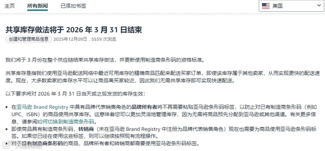 亚马逊官方已明确公告:自2026年3月31日起,亚马逊将正式终止共享库存政策,同步更新制造商条码使用规则。此次变更将被影响的站点有:美国站、加拿大站、墨西哥站、欧洲站、澳大利亚站和日本站。