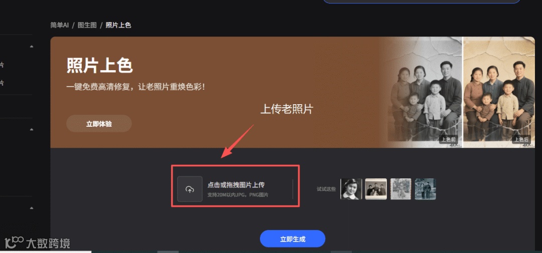 - 打开搜狐简单AI平台,进入"照片上色"功能并上传老照片