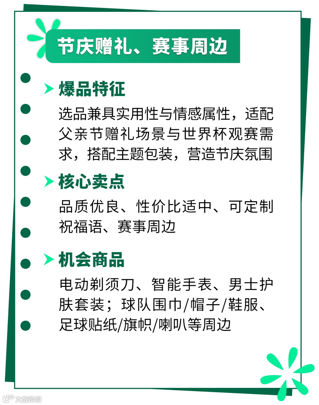 5月起Hot Sale、2026世界杯及父亲节、返校季形成密集消费节点,呈现集中爆发、精准赠礼、批量采购特征。商家可借节点高曝光优势实现销量突破:Hot Sale作为上半年最大电商节,全品类放量带动囤货消费;世界杯催生赛事周边及观赛装备需求,建议联动体育达人营造狂欢氛围;父亲节主打男性个护、数码类情感赠礼;返校季推出学生用品组合套装,契合批量采购场景。