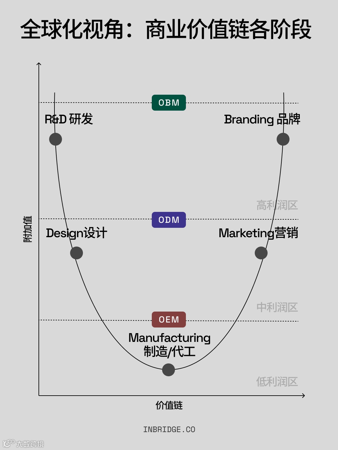 全球价值链呈现典型"微笑曲线":研发与品牌位于高利润区,制造端处于低利润区。从OEM到OBM的跃迁,本质是从价值链底部向研发与品牌两端的攀登。