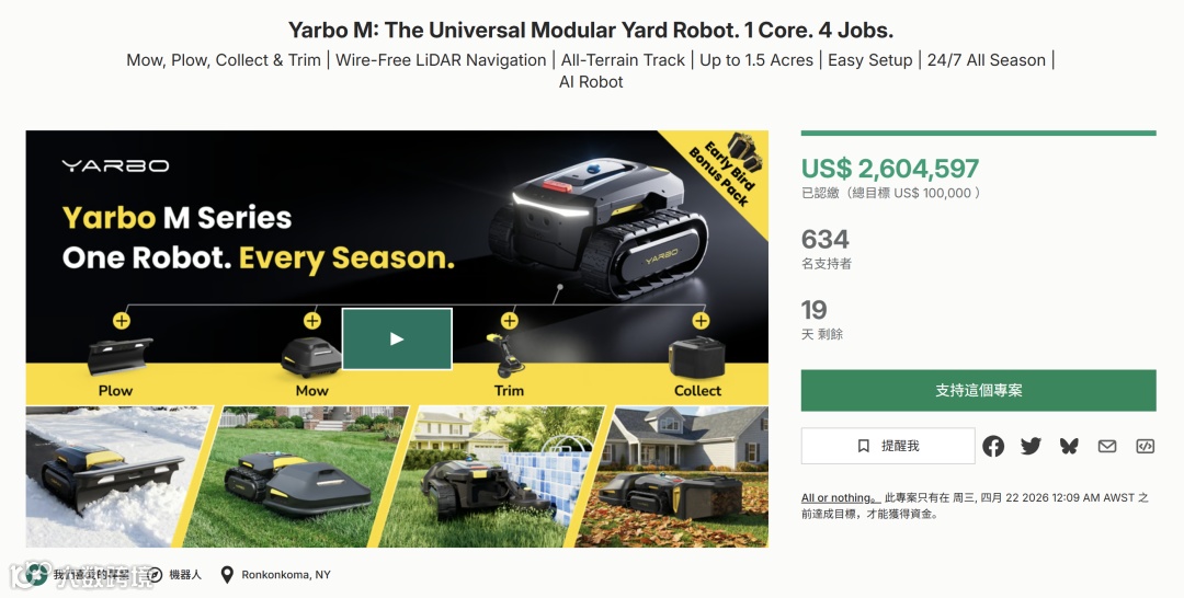 截至目前已筹得260万+美金、吸引600+人支持,Yarbo M正在重新定义"庭院维护"。通过模块切换覆盖割草、扫叶、推雪等全年任务,并在复杂庭院环境中实现自动作业,该设备提供的不再是一个工具,而是一套"全季节庭院自动化方案"(所有数据均来源于公开渠道,内容拆解仅限于外部分析,不涉及任何敏感或专有信息)。