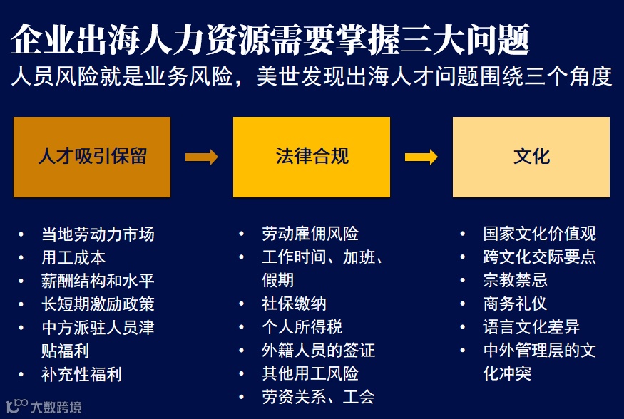 全球化人力资源管控面临四大挑战:协同问题、文化交流障碍、人才错配及管控模式不适配。企业出海需聚焦三大核心:当地劳动力市场与用工成本、雇佣合规风险、文化价值观差异管理。人员风险等同业务风险,构建系统性全球化人才管理体系至关重要。