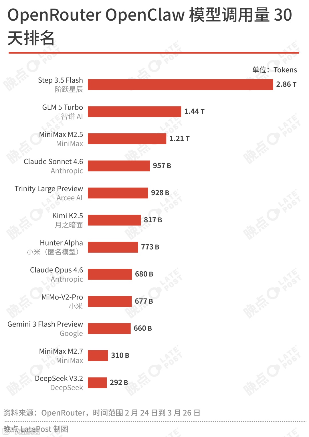 同期行业竞争主线转向Agentic模型(OpenClaw等)和多模态生成(GPT-4o、Seedance 2.0)。DeepSeek未跟进多模态,仅在V3.2强化Agent能力。OpenRouter数据显示,其模型位列中国开发者常用模型第12位。