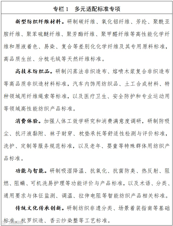 研制新型纤维材料、功能性产品及适老宜小等标准,拓展纺织应用领域;推进纺织非遗和国潮文化标准建设;加快纺织机械标准制修订。