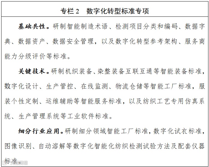 建立研发设计、生产制造全流程数字化标准体系,研制物联网、人工智能等融合应用标准;重点开发纺织数字护照、产品追溯等关键技术标准。