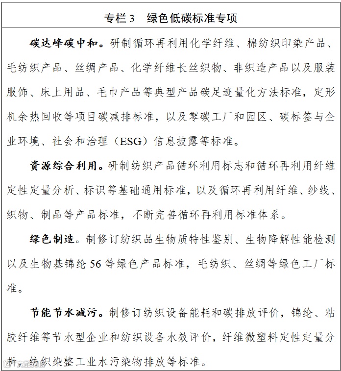制定碳足迹核算规则及废旧纺织品循环利用标准;研发生物基可降解材料、绿色工厂等标准;开展短流程纺纱、少水染色等低碳工艺预研。
