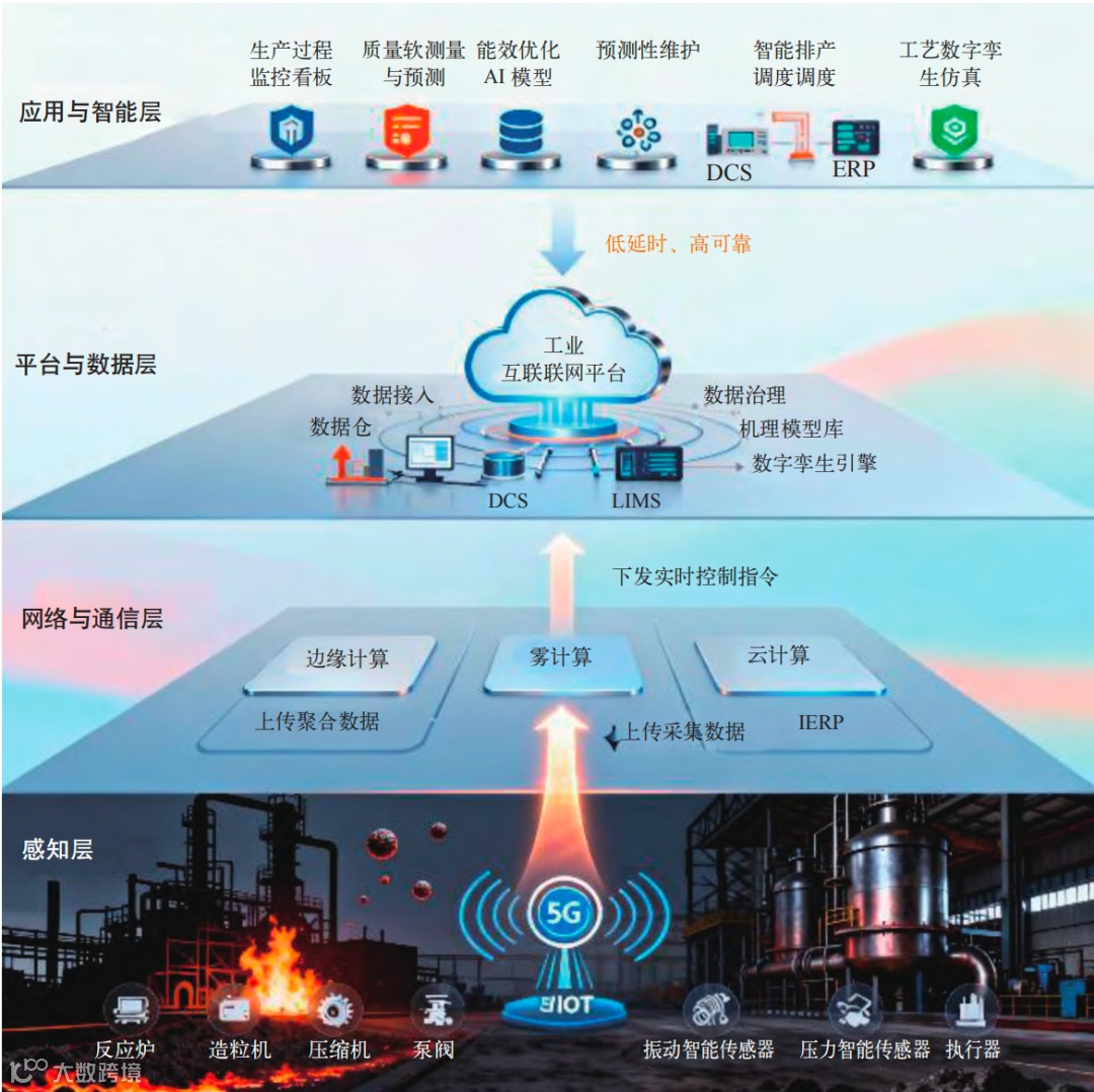 5G网络支撑海量设备低延时连接;工业互联网平台统一管理设备数据。边缘计算处理紧急停机等实时指令,雾计算负责单台反应炉优化,云计算实现全厂级调度与模型训练。