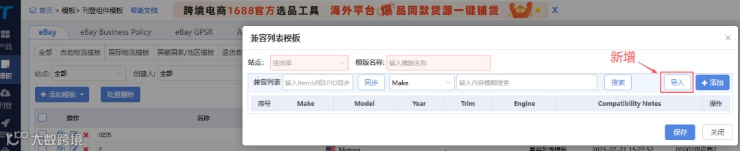 eBay组件模板兼容列表功能新增导入模板选项。