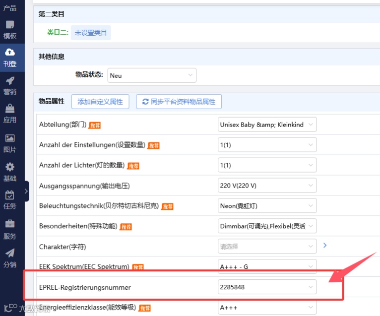 eBay欧盟及英国站点新增能源信息填写功能,部分类目支持EPREL注册编号。若类目未显示该属性,用户可点击【更新类目信息】或【添加自定义属性】为EPREL-Registrierungsnummer。