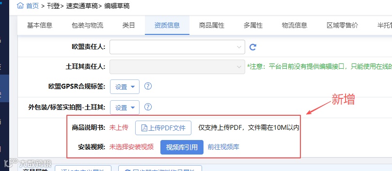 速卖通草稿及在线模式新增商品说明书与安装视频功能。