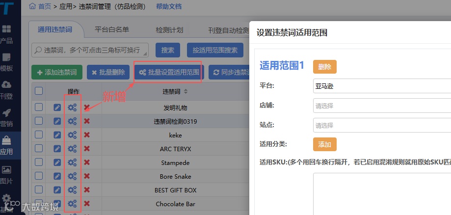违禁词管理应用新增多维适用范围设置,支持指定平台(当前限亚马逊)、店铺、站点、产品分类及SKU。相关违禁词规则保存后仅在所选范围内生效。