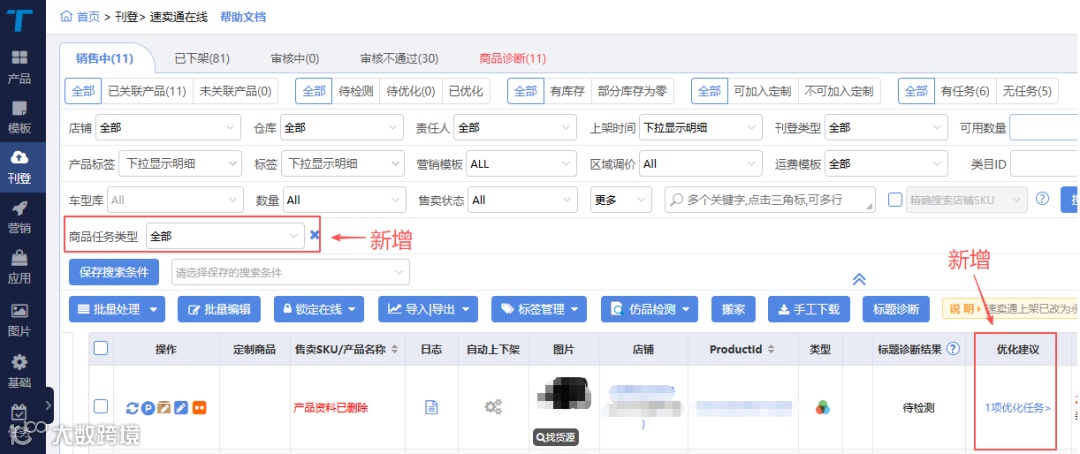速卖通在线版本新增商品任务类型筛选功能,支持查看商品优化建议。
