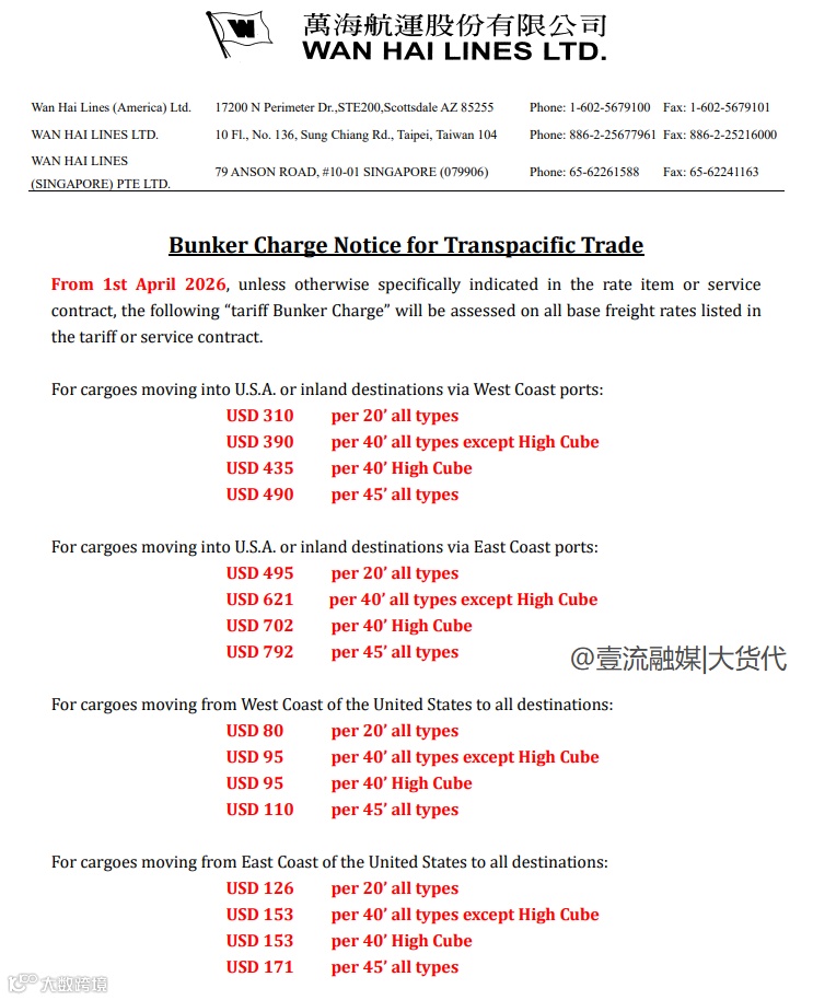 万海航运宣布自4月1日起征收跨太平洋贸易燃油附加费,覆盖美西及美东航线: