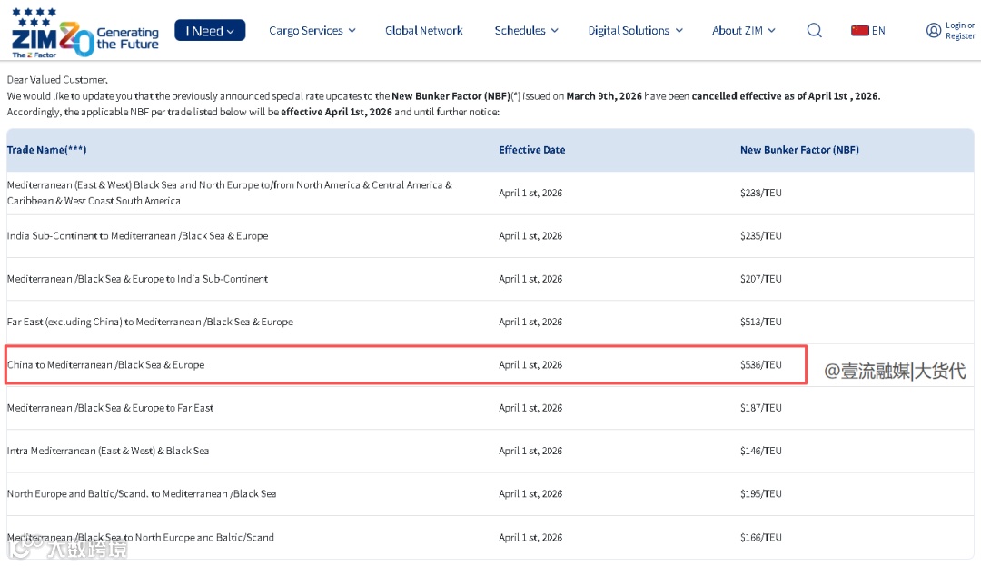 以星取消3月9日发布的紧急燃油附加费(EFS)通知,自4月1日起调整费率。目前,中国至地中海/黑海和欧洲航线每标准箱加征536美元。