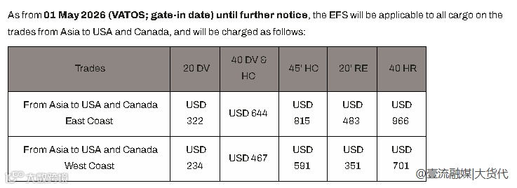 地中海航运(MSC)宣布调整亚洲至美国、加拿大紧急燃油附加费(EFS),自2026年5月1日起生效。较3月11日通知的费用标准有所提高,具体实施时间及幅度以最新公告为准。