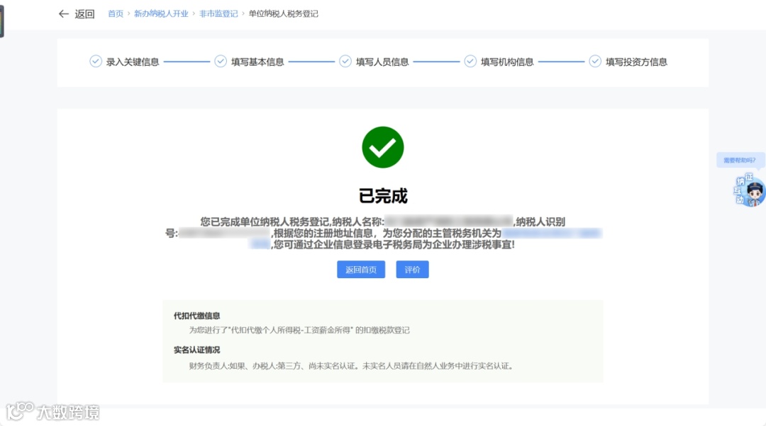 ⑥ 系统显示单位纳税人税务登记成功,并自动完成代扣代缴登记及主管税务机关分配。