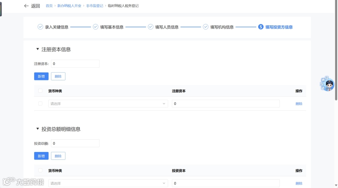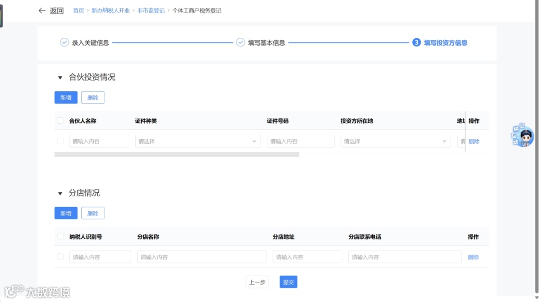 - “分支机构”:填写上一级机构信息后进入投资方信息采集。