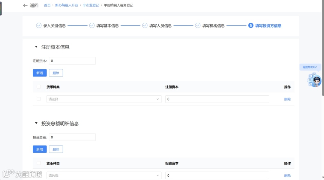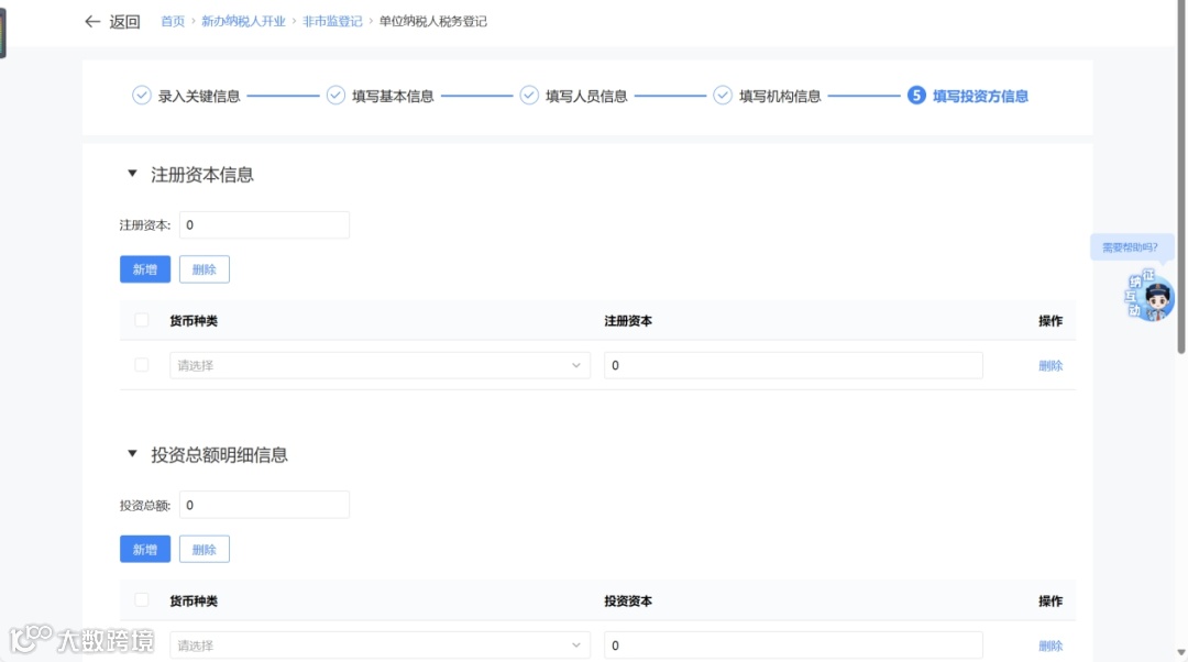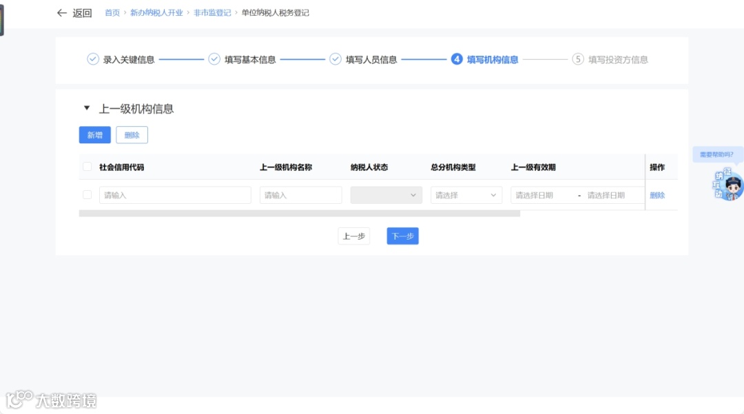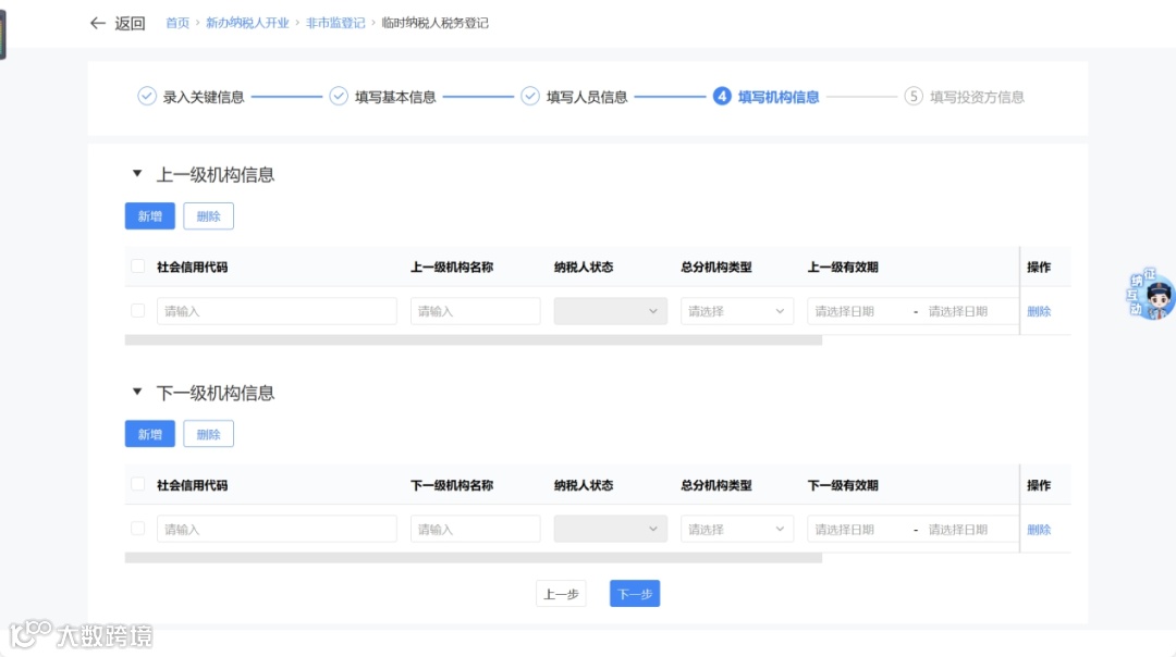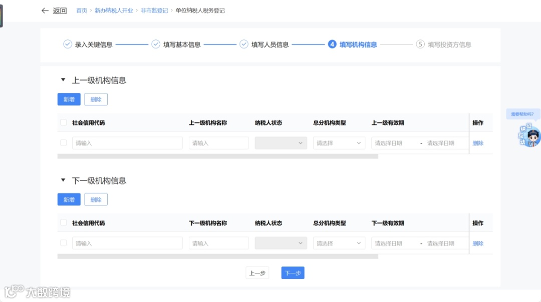 - “分总机构”:填写上下级机构信息后进入投资方信息采集。