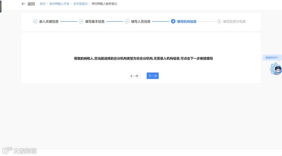 - “非总分机构”:点击【下一步】直接进入投资方信息采集;如需填写机构信息,需返回修改类型。