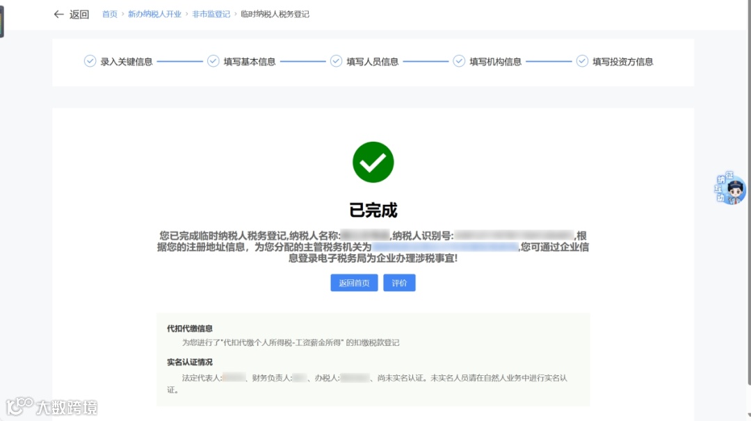 ⑥ 系统显示临时纳税人税务登记成功,并自动完成代扣代缴登记及主管税务机关分配。