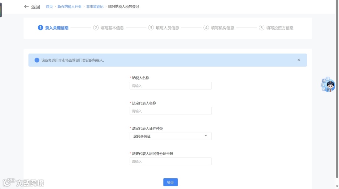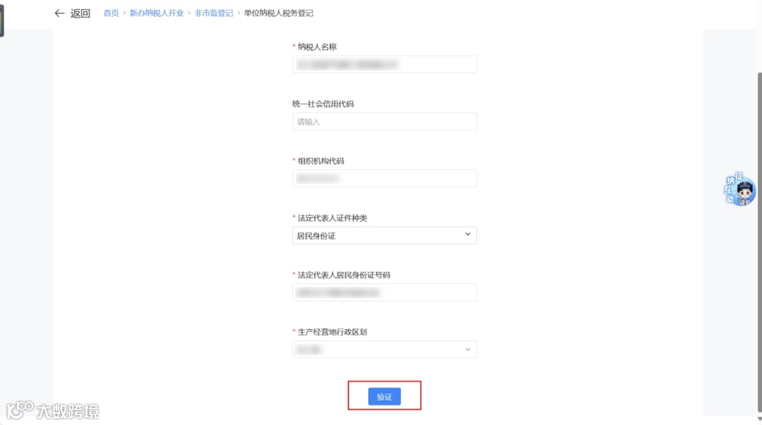 ① 填写纳税人名称、法定代表人姓名等关键信息,点击【验证】。