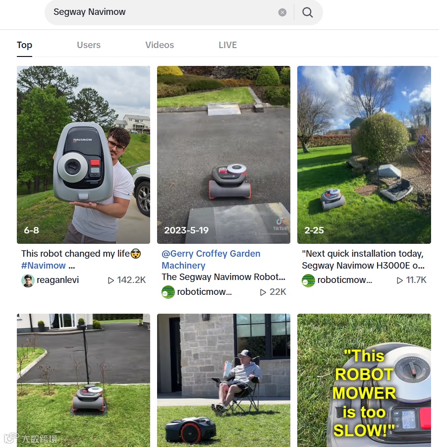 同时,通过TikTok、YouTube等社交媒体平台推动产品的口碑度,在TikTok上搜索Segway Navimow可以看到,大量视频的播放量都在几十万甚至几百万之多。这些视频通过展示割草机器人的操作方法,将产品便捷、智能的特性直观地呈现给了用户,进一步推动了产品在用户群体中的口碑传播,从而为产品赢得了更多的潜在消费者。